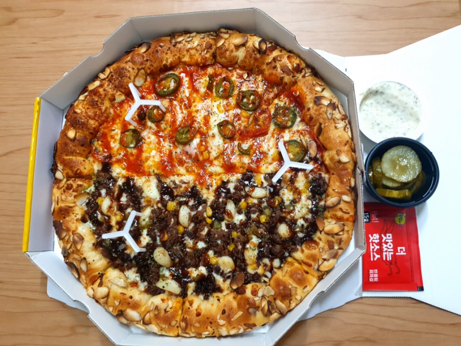 메뉴는 통마늘불고기 고스트페파로니 반반으로 꼬다리에 밤이랑 크림치즈가 들어있는 걸로 선택했다.