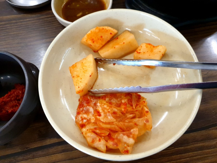 작은 반찬통에 무와 김치가 준비되어 있고 접시에 덜어 먹을수 있다.